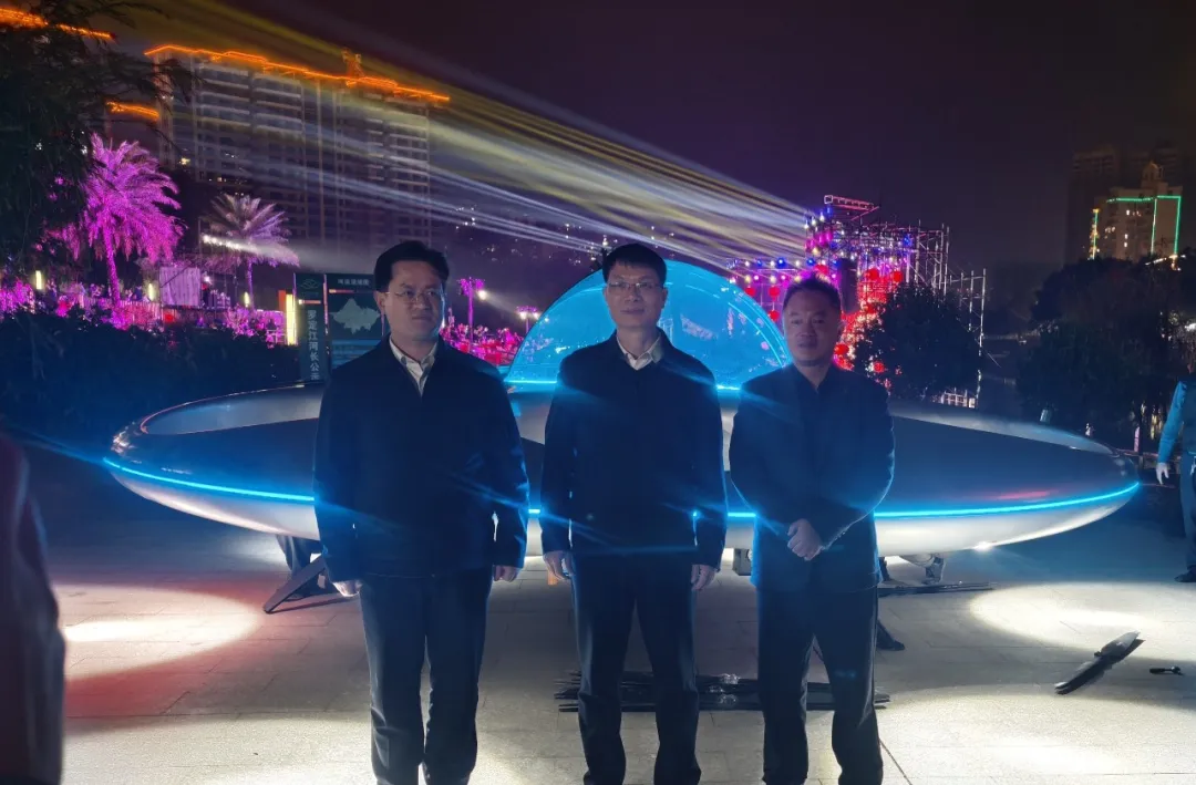 当主持人那充满激情与活力的声音宣布启动仪式正式开始,全场观众的目光瞬间聚焦在舞台。刹那间,智航飞碟eVTOL如一颗划破夜空的神秘流星,缓缓升空,惊艳亮相!它周身散发着科技感十足的光芒,仿佛来自未来自星际的使者,带着对新春的美好期许降临地球。飞碟底部精心设置的LED屏上,滚动播放着对市民们最真挚的新春祝福,那一句句温暖的话语,如同冬日里的暖阳,直抵人心。
